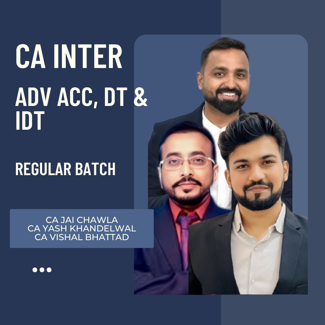 CA Inter Adv Acc, DT, & IDT Combo Regular Batch by CA Jai Chawla, CA Yash Khandelwal & CA Vishal Bhattad. These Lectures are Beneficial for Jan 26 & May 26 Exams . Study Material will be provided with the same.