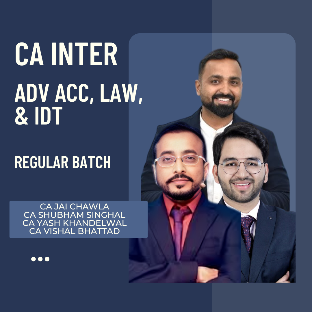 CA Inter Adv Acc, DT, & IDT Combo Regular Batch by CA Jai Chawla, CA Yash Khandelwal & CA Vishal Bhattad. These Lectures are Beneficial for Jan 26 & May 26 Exams . Study Material will be provided with the same.