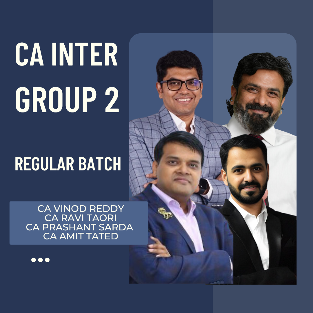 CA Inter Group 2 Combo Regular Batch by CA Vinod Reddy, CA Ravi Taori, CA Prashant Sarda & CA Amit Tated. These Lectures are Beneficial for Jan 26 & May 26 Exams. Study Material will be provided with the same.