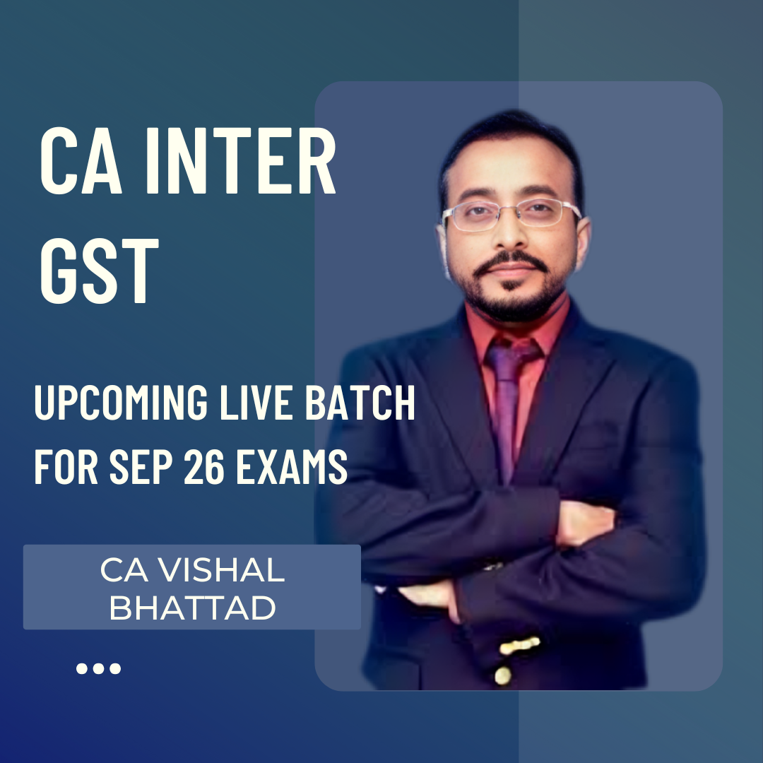 CA Inter GST by CA Vishal Bhattad in 125 hrs with Unlimited Validity. These Lectures are Beneficial for Sep 26 & Jan 27 Exams. Study Material will be provided with the same.