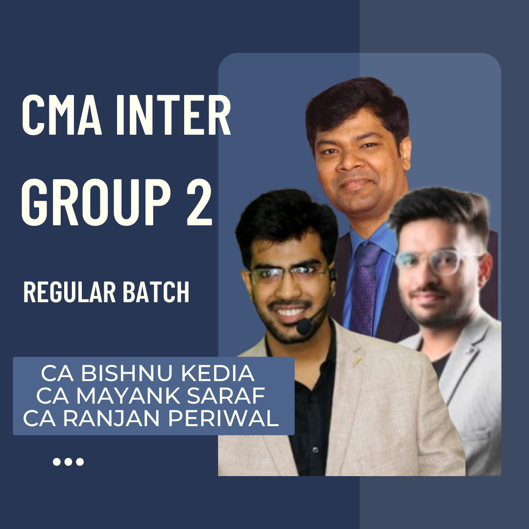 CMA Inter Group 2 Regular Batch Combo by CA Ranjan Periwal, CA Mayank Saraf & CA Bishnu Kedia for Dec 25 Exams. Study Material will be provided with the same.